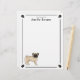 Destei's originele cartoon illustratie van een schattige fawn coat kleur Pug rashond. De hond staat en kijkt naar de kijker. De staart is gekruld op de bovenkant van de rug van de hond. De kleur van het lichaam is licht beige, maar er zijn donkerdere details op de oren, snuit en ogen van de hond waardoor de look van een "zwart masker" bekend om fawn kleur Pugs. Er is ook wat donkerdere schaduw op de punt van de staart van de hond. De mond van de hond is gesloten en de oogkleur is bruin. De hond wordt in een hoek geplaatst en het ontwerp is omlijst door randen die een hondenpootafdruk in elke hoek hebben. Bovenaan zijn er twee gepersonaliseerde tekstgebieden.