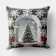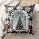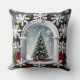 Een feestelijk arrangement met een besneeuwd raam versierd met witte sneeuwvlokken, levendige groene pijnbomen en klassieke rode vakantiedecoraties, waardoor een pittoreske seizoensgebonden omgeving ontstaat.