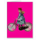 fietsenmeisje met een rood pet en blauwe jurk. Het is tegen de neonroze basis. Antiek grafisch afbeelding met grote details. Met dank aan de grafische kaart. U kunt deze aanpassen met jouw tekst - u kunt de achtergrondkleur wijzigen.