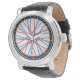Een Fietswiel met spaken in rood, geel, blauw & groen decoreert dit zwart lederen en roestvrijstalen polshorloge.