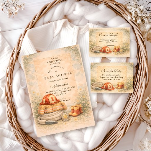 Celebrate a little hero on the way with this cute firefighter baby shower design, illustrated in a warm, storybook style. Featuring classic firefighter details like a helmet, jacket, boots, and fire truck accents, the artwork feels sweet, cozy, and timeless rather than loud or cartoonish.