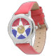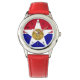 Watch with flag of city of Dallas, Texas; flag with red and blue horizontal bands with seal of the city inside of a white star in the center