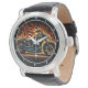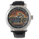 This close-up image features a striking watch face adorned with a powerful illustration. A custom chopper-style motorcycle, engulfed in vibrant orange and yellow flames, dominates the center. The dark background enhances the fiery effect, while clear silver numbers and watch hands provide contrast, creating a bold and dynamic accessory for motorcycle enthusiasts.