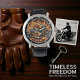 This close-up image showcases a distinctive watch face with a bold, fiery illustration. A vintage-style motorcycle with a sidecar, both adorned with vibrant orange and yellow flames, dominates the center. Large, feathered wings extend from the motorcycle's back. The dark background highlights the fiery design, creating a dynamic and striking timepiece.