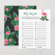 Het baby shower uitnodigingsontwerp heeft roze flamingo met weelderige groene bladschijfjes en tropische hibiscusbloemen. "Aloha Baby". Een tropisch bloemenpatroon met zwarte achtergrondkleur kleedt zich op de achterkant van de kaart.