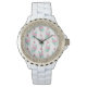 Tropisch trendy patroon met roze flamingos, watermeloen en groene palmbladeren op een witte achtergrond. | © en ® Bigstock® - Alle rechten voorbehouden.