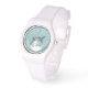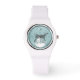 Mooie Ladies' Flat Earth Map Watch in Turquoise 'Zee' met witte 'South Ice' Ring en 'Polar' White Bezel, Hour & Minute Hands en Strap. Het afbeelding toont het Licht & de Beweging van de Zon rond het Vlakke Oppervlak van de Aarde en Wereldcontinenten. Verkrijgbaar in zwart of wit horlogeband.