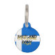 Sommige schattige, bruine cartoon pony's verdraaien zichzelf in de vorm van letters. Deze pony's gebruiken hun bendy pony's om de woorden "SHETLAND PONY" te spellen. Het afbeelding is de vlag van Shetland, de kleuren van de Schotse vlag (blauw, met een wit kruis), in de vorm van het Noordse kruis.