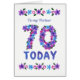 Een , bloemrijke 70e verjaardag Kaart voor een Partner. De nummers bestaan uit roze, blauwe en paarse bloemen. Dit ontwerp is gemaakt van een handbeschilderd papieren collage van Judy Adamson en je kunt de binnentekst desgewenst bewerken.