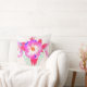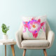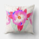 Dit gooi kussen kunstwerk shows wervelen hibiscus bloemen in magenta, roze en karmozijnrode kleuren op een witte achtergrond die een lichte, houten textuur heeft, waardoor het een dromerige look.