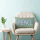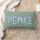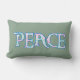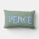 Een zeer lendenkussen met het woord 'PEACE' in een script gevuld met een roze en blauw bloempatroon dat op een zachte groene achtergrond wordt geschetst.
