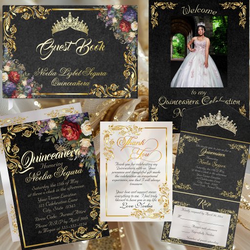 Floral & Gold Leaves - Black & Pearl QuinceneraOntworpen door Beth Harsh