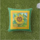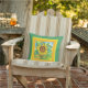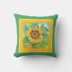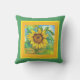 Een fel en vrolijk bloemontwerp voor binnen of buiten! Een grote zonnebloem in geel en oranje, op een coördinerende groene kussen. Vele grootte en stof types om te kiezen van.