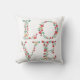 Dit zoete LOVE kussen is voorzien van decoratieve bloemenletters die LIEFDE spellen. Elke letter heeft een groene wijnstok met felrode bloemen. Sommige letters bevatten een envelop en/of een rode kroon. De kleuren zijn groen, rood en gebroken wit. De achterkant heeft een coördinerende rode kleur.