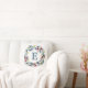 Floral omgeven monogram gooit kussen in grays, blauw, geel en roze op een witte achtergrond.