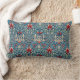 Intricate floral pattern with red, cream, and green leaves on a blue background. Symmetrical design evokes a classic, elegant, and ornate feel.