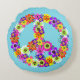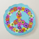 Een floraal vredesteken in tinten roze, geel, oranje, paars, groen, wit en zwart.