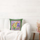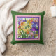 bloemkussen, beschilderde irissen in roze/paarse vorm, op donkerbladgroene kussen.