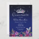Lieve faux-shinny sterren aan de bovenste grens. Elegant en trendy ontwerp met fancy manuscripttypografie. Alle tekst kan worden aangepast en kan eenvoudig worden gewijzigd voor uw eigen wensen. Geweldig elegant Quinceañera-ontwerp. Beschikbaar in verschillende kleuren. Mooie prinses tiara met bloemkool. Blauwe vlinder met aan de onderste florale grens. Verschillende achtergrondkleuren beschikbaar.