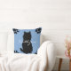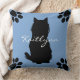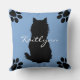 Silhouette van een lange zwarte kat, bekeken vanaf de voorkant, met haar oren omhoog en staart die naar links piept. Vier kat poten en de hoeken. Jouw naam of keus van tekstvertoningen over het centrum in een wit manuscript. Getoond op een blauwe achtergrondkleurenoptie. Kunstwerk en ontwerp door Karlajkitty