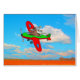Grijze hond vliegt met een rood vliegtuig in de lucht met wolken.