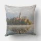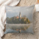 Gooi een kussen met een fogige zonsopgang bij het Bled-meer met een kerk en mist met reflectie in het water in het eerste zonlicht van de ochtend in Slovenië.