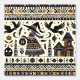 Een behang voor alleen de gelegenheid van spookachtigheid, oplichterij, schattigheid en volkskunst. De illustratie toont een heks die vanuit haar spookhuis gaat winkelen met haar gebruikelijke metgezellen - jack of lantaarns, zwarte vogels en haar tas met toverdrank. Ideaal voor Herfst festivals en Halloween. Precies goed voor een geweldig cadeau voor verjaardagen en house warming.