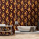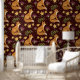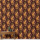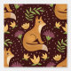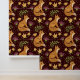 A charming pattern of seated orange foxes surrounded by yellow and purple flowers, green leaves, and dotted accents on a rich burgundy background.