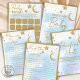 Pacifier Hunt Baby shower Game! Dit baby shower speelt zich af tegen een grillige wolkenachtergrond en bevat gouden maan en sterren. Dit is een perfect ontwerp voor genderneutrale baby showers en meer! Coördineren van babyshower uitnodigingen, decor, en borden ook beschikbaar.