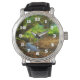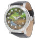 Een horloge met een helder groen bos met een wikkelkreek. De bruine bladeren bedekken de bosvloer, wat een mooi contrast vormt met de weelderige groen van deze magische bossen.