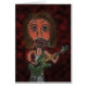 Een digitaal afbeelding van een uitgebrande rockster gemaakt van een potloodschets. De muzikant speelt op een groene gitaar en heeft bruin haar en een roze huid. Het stripfiguur heeft grote lippen en donkere kringen rond zijn ogen. De achtergrond is een verbrande donkerrode met wervelingen van zwart en een subtiel zoomeffect.