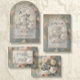Elegant formeel dinermenu in een stijl huwelijksuitnodiging collectie met een impressionistische, Victoriaans oude meesterstijl schilderij van een blush roze en boter gele rozen in een bloemig boeket geplaatst in een antiek Franse urn vaas over een warme stoffige blauw kasteelmuur achtergrond. Een gouden en ivoren metalen boog in een driedimensionaal ogend lijst met zacht doorzichtig velum interieur maakt de stijlvolle luxe tijdloze stijl af. Dit ontwerp is gemaakt en grafisch ontworpen door een internationaal erkende kunstenaar en ontwerper, Audrey Jeanne Roberts, copyright. MSP0142