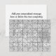 Vermoedelijk van dezelfde oude saaie wenskaarten? Voeg je eigen foto en persoonlijke boodschap toe aan creëer een 63-stuk gepersonaliseerd "mock" puzzel wenskaart voor je vriend of geliefde! Snijd gewoon langs de puzzelstuklijnen en plaats ze in de bijbehorende envelop. De ontvanger zal de puzzel moeten samenvoegen om uw groet te zien! **OPMERKING: DIT IS GEEN WERKELIJK PUZZEL EN DE stukjes zijn NIET geperforeerd - u moet ze met de hand snijden** Dit product is verkrijgbaar in 6, 9, 12, 30 en 63 stuks. **Dit ontwerp is ook beschikbaar in andere opties. Kopieer en plak deze URL in uw browser om ons assortiment aanpasbare puzzelwenskaarten te uitzichten: http://www.zazzle.com/malibuitalian*/puzzle+gift