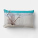 Een kussen met een prachtige foto. Tropisch blauw water en schuimend surf op de achtergrond. Een collectie schelpen en stengels op een wit zandstrand.