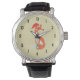 Een horloge met een leuke oranje vossenillustratie. Hij draagt ook een rode kerstmuts en heeft feestelijke groene decoratieve accenten op zijn staart en over zijn borst.