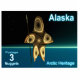 Dit postzegel voor een onafhankelijke Alaska is voorzien van een bruine fractaal afbeelding dat een sterk gestileerde Eskimojager suggereert, die traditionele bontkleding draagt en een harpoen met een ivoren kop vasthoudt. De jager wordt overgeplaatst op een achtergrond die de donkere polaire winter weergeeft - een blauwe sneeuwoppervlakte, een donkere sterrenhemel met de groene gloed van de noordelijke lichten aan de horizon. De tekst "Alaska," "Arctic Heritage" en "Postage 3 Nuggets" staan in blauw en wit glanzend.