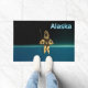 Een bruine fractale afbeelding die suggereert een hooggestileerde Eskimojager, die traditionele pelskleding draagt, die een harpoon met een ivoren kop vasthoudt. Het afbeelding wordt overgeheveld op een achtergrond die de donkere polaire winter weergeeft. "Alaska" staat in gloeiend blauw en wit.