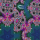 Dit afbeelding is een levendig, caleidoscopisch fractaal kunstwerk dat barst van ingewikkelde patronen en wervelende design. In het midden straalt een diepblauwe sterachtige vorm naar buiten, omringd door spiraalvormige ranken van levendige roze, paarse en oranje tinten. De ingewikkelde lussen en bochten creëer vormen een betoverende symmetrie, terwijl hints van groen en blauwgroen diepte en contrast toevoegen. Het kunstwerk roept een gevoel van oneindige complexiteit en kosmische verwondering op, waarbij elementen van geometrie en organische stroom worden gecombineerd in een hypnotiserend, buitenaards ontwerp. Perfect voor diegenen die aangetrokken worden door de schoonheid van wiskundige kunst en abstracte expressie.