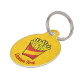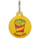 Cartoon illustratie van een klein pakje frietjes. Junk food outline iconen geel patroon achtergrond. Aangepaste tekst aan beide zijden.