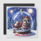 Kleine französische Bulldoggen im Schnee mit toller großer Weihnachtskugel. Die niedlichen Hunde wünschen Frohe Weihnachten und haben viele schöne Geschenke geschmückt mit tollen Schleifen dabei. Lustige , romantische Illustration mit Sternen und Mondschein zum Feiertag.