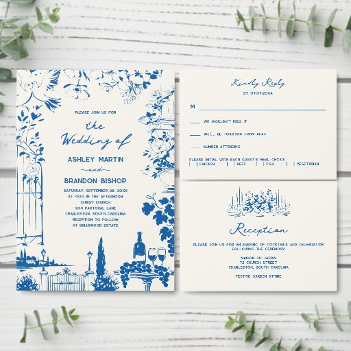 French Blue Whimsical Ribbon and Bow Wedding Informatiekaartje