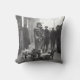 Kick back with this iconic throw pillow featuring a vintage black and white image of a dog walker with a group of french bulldogs in the city.