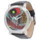 Elevate your style with this Black Vintage Leather Watch featuring Frequency Serpent. A serpentine red structure curves vertically across the dial, marked by circular elements resembling vibrational cores, while horizontal bands of blue, green, and white flow in the background like waves of data. The interplay of intense colors and curved forms creates dynamic tension, transforming this classic leather watch into a wearable canvas of digital abstract art. Perfect for everyday wear, gifting, or as a statement accessory.