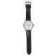 Front and back views of a wristwatch with a patterned white face and black leather strap. The watch has a sleek silver casing, conveying elegance.