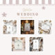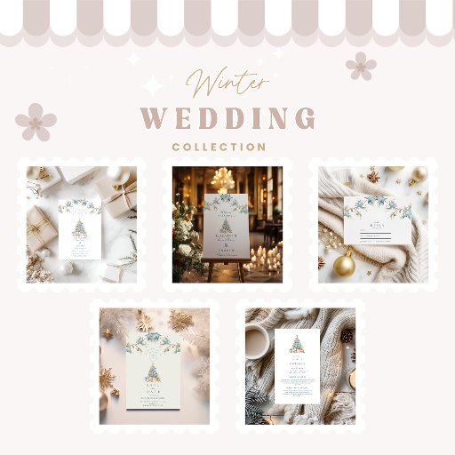Dit delicate ontwerp heeft een zachte waterverf kerstboom versierd met ijzige blauwe ornamenten en pastelgeschenken, omlijst door gouden dennentakken en blauwe sterren. Een dromerige en romantische kijk op een esthetische winterbruiloft - elegant, grillig en vol seizoensgebonden charme.