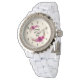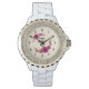 Een horloge ontworpen met fuschiapies en decoratieve sprigs en bladeren in een cirkelvormige florale poot. Gelukkig Moederdag, geschreven in een schattig trendy lettertype. en elegant.