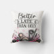 Fun-ironische kussen voor make-up-liefhebbers, met de titel "Beter laat dan lelijk", in zwarte moderne typografie, gedecoreerd met een prachtige illustratie van cosmetische producten. Voor douaneverzoeken, verdere verpersoonlijking, of kleurencombinaties, te voelen gelieve vrij om me in zolicestore@hotmail.com te contacteren