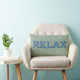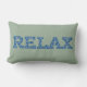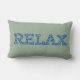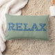 Een leuke lumbale kussen met het woord 'CHILL' in letters gevuld met een blauw en wit patroon op een zachte groene achtergrond.