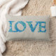 Een leuke lumbale kussen met het woord LOVE in letters gevuld met een blauw en groen bloempatroon op een hessian-gekleurde (burlap) achtergrond.