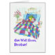 Een Get Well kaart om te personaliseren voor een zoon, met een groene kikker, liggend in bed met een warmwaterfles en medicijnen, druiven en bloemen rondom hem, van een handgeschilderde grillige illustratie van Judy Adamson. U kunt het inside bericht wijzigen als u dat wenst.